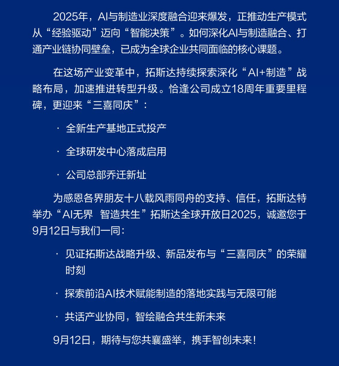 9月12日,邀您莅临拓斯达全球开放日2025
